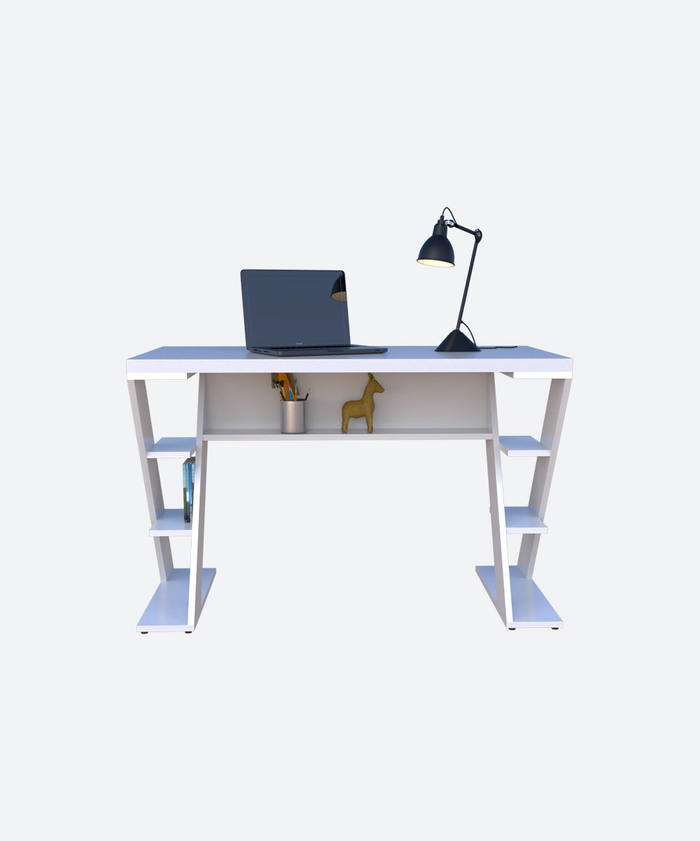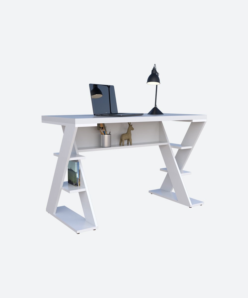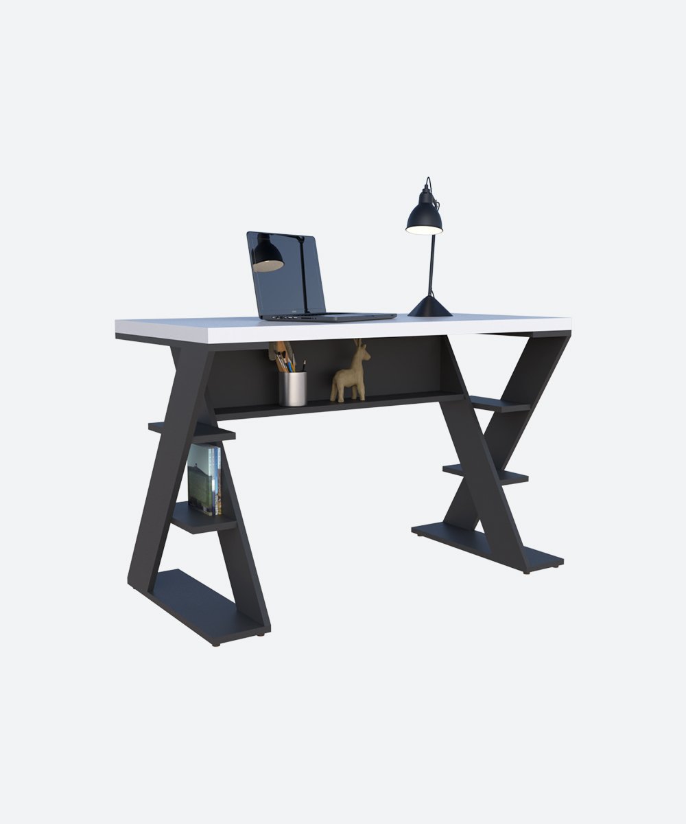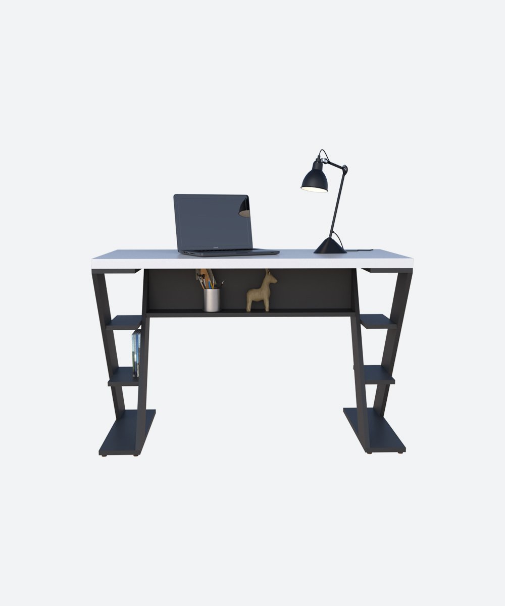 Ce bureau au design moderne allie style et fonctionnalité avec ses pieds en forme de Z et ses étagères latérales intégrées. Idéal pour un espace de travail organisé, il dispose d’un plateau spacieux, d’une niche centrale pratique et de rangements pour livres ou accessoires. Parfait pour le bureau à domicile, les études ou le télétravail.