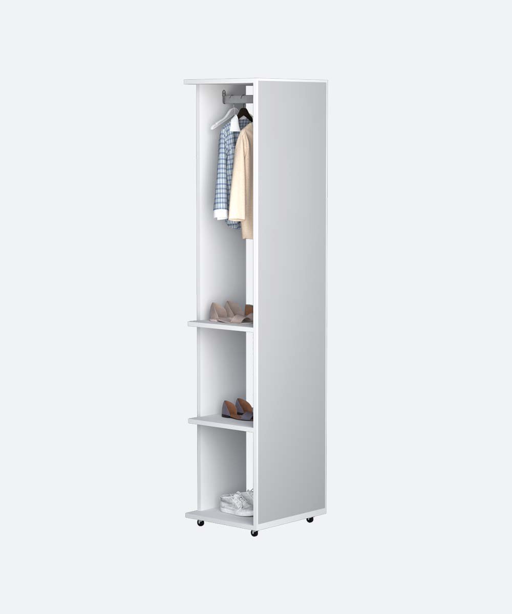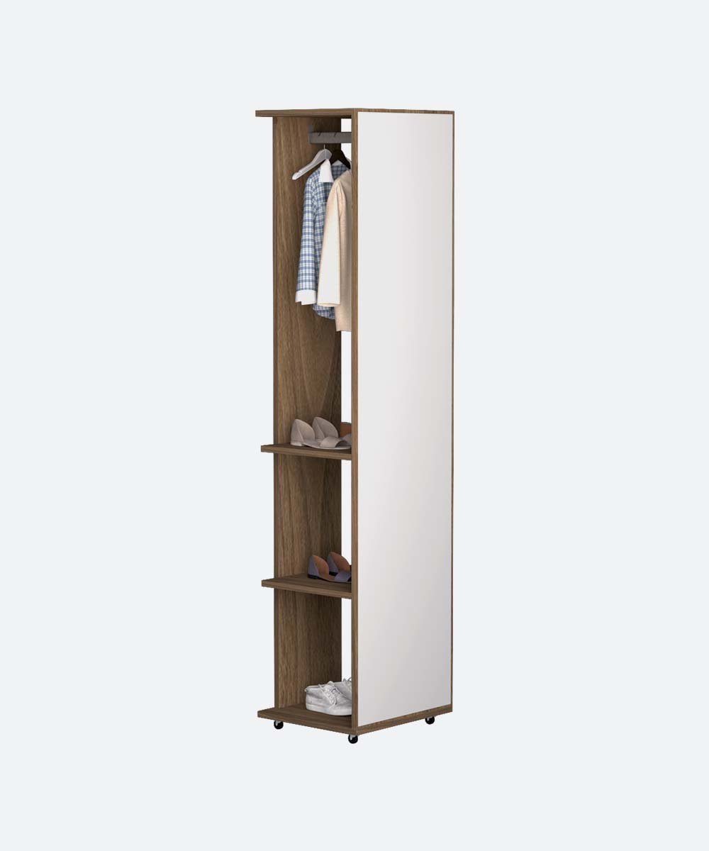 Apportez style et praticité à votre intérieur avec ce miroir multifonctionnel en MDF. Il comprend des étagères pour le rangement, un suspendur pour vos vêtements et des roues pour un déplacement facile. Idéal pour organiser votre espace avec élégance et efficacité.